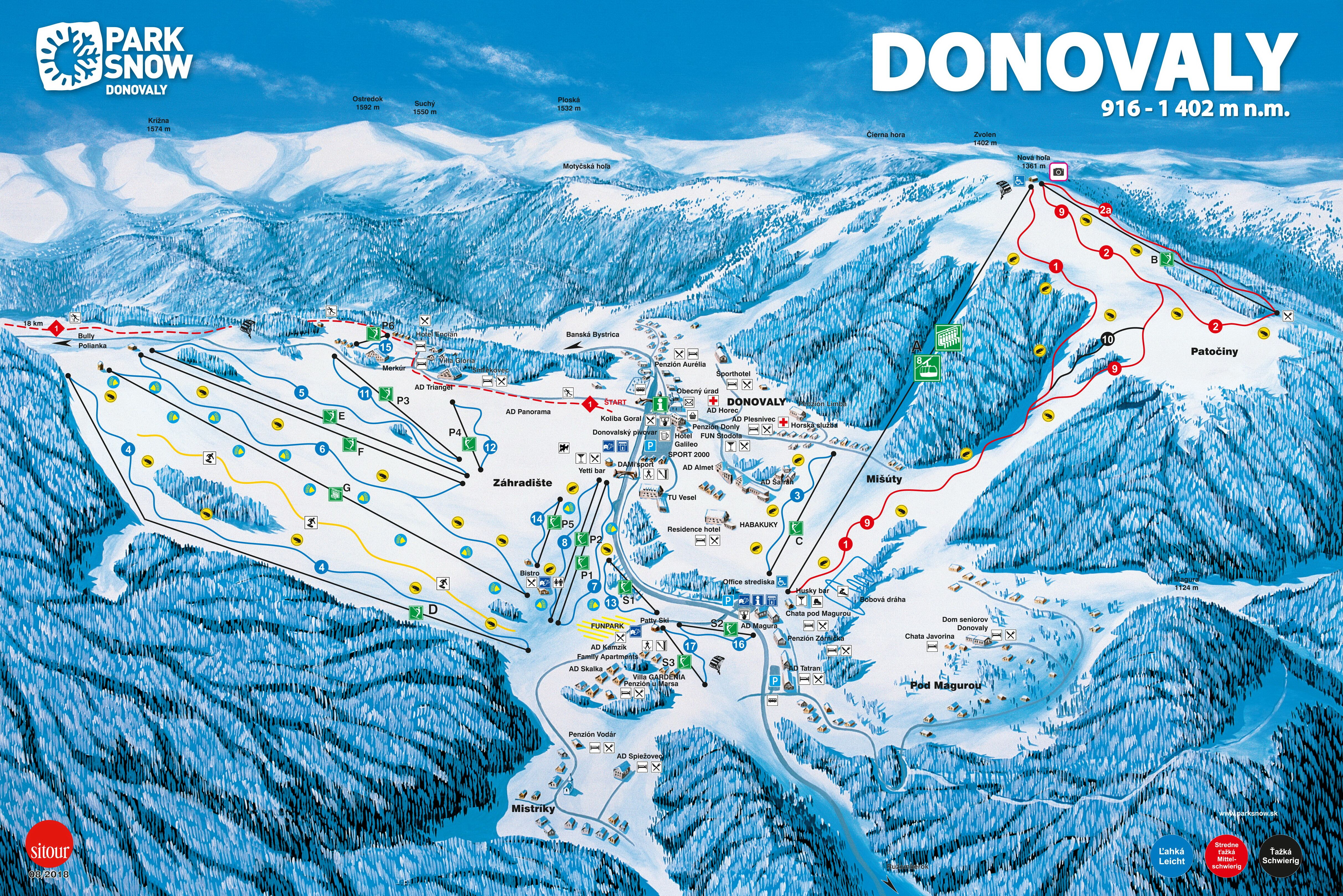 Excellent skiing conditions on perfectly groomed slopes and tracks for slalom, downhill, cross-country or the ever increasingly popular snowboarding. Ski slopes, at 900 – 1,361 metres above sea level with a total length of 11 km, are honed with snow cannons and perfectly prepared for skiers of every age group. Don’t miss out on the chance to try nighttime skiing or get a bird’s eye view of Donovaly by paragliding. If you are drawn to freeride or freestyle with its rails, jumps and other obstacles, then we’ve got our snowboard park just for you. Or do you want to skate, or go sledging, or try a ride in a dog-sledge or horse drawn sleigh, or go bowling, or stay indoors and ski on a trainer? Absolutely no problem here in Donovaly! And then in summer, Donovaly changes into an oasis of calm, ideal for relaxing, or an active rest for hikers and cyclists in the breathtaking countryside of the Low Tatra and Large Fatra National Parks.